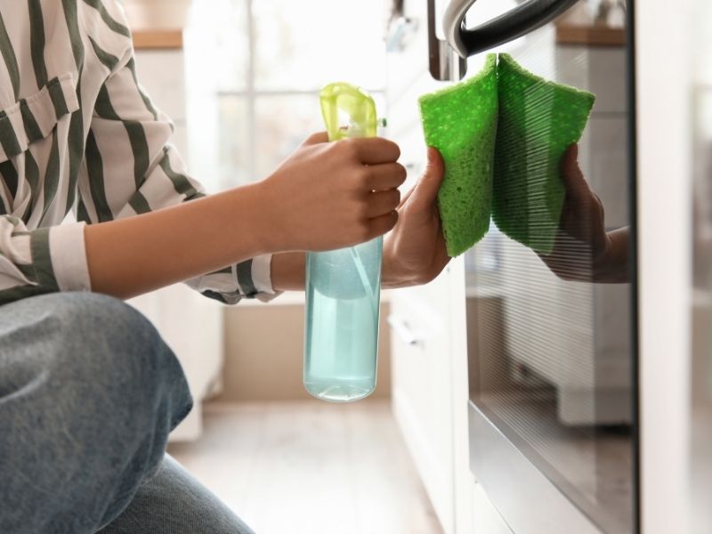 If you'd rather avoid scraping altogether, try the steam method. Place a heat-proof dish filled with water and a splash of white vinegar on the middle oven shelf. Heat the oven to around 100°C and let it run for about 30 minutes. The steam produced will loosen grease on the glass door, making it easier to wipe away.